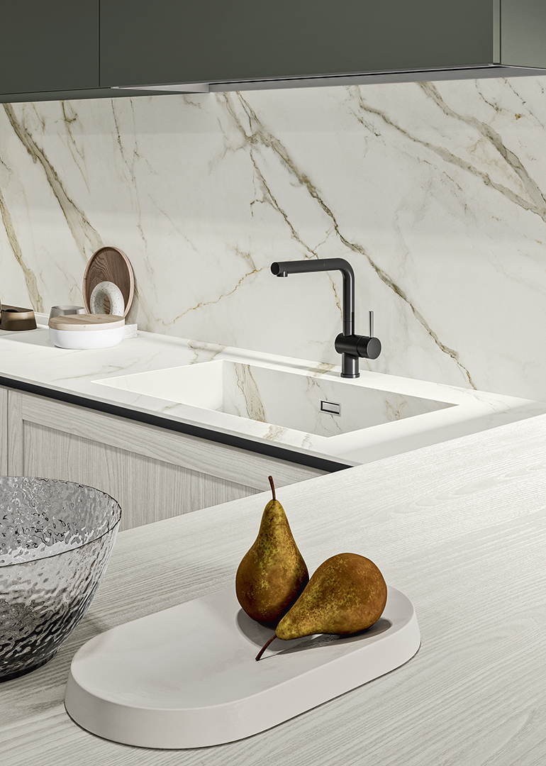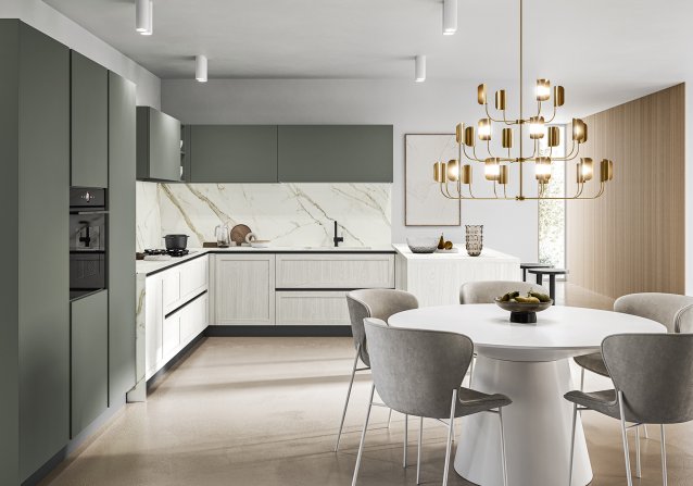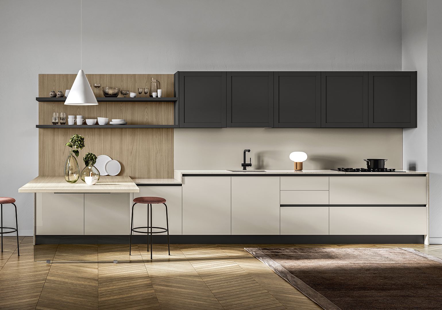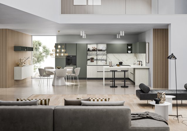 La cucina si organizza intorno a noi, creando angoli di benessere personalizzati. L'isola, collegata alle basi dal piano snack, diventa il punto focale dell'ambiente cucina.
