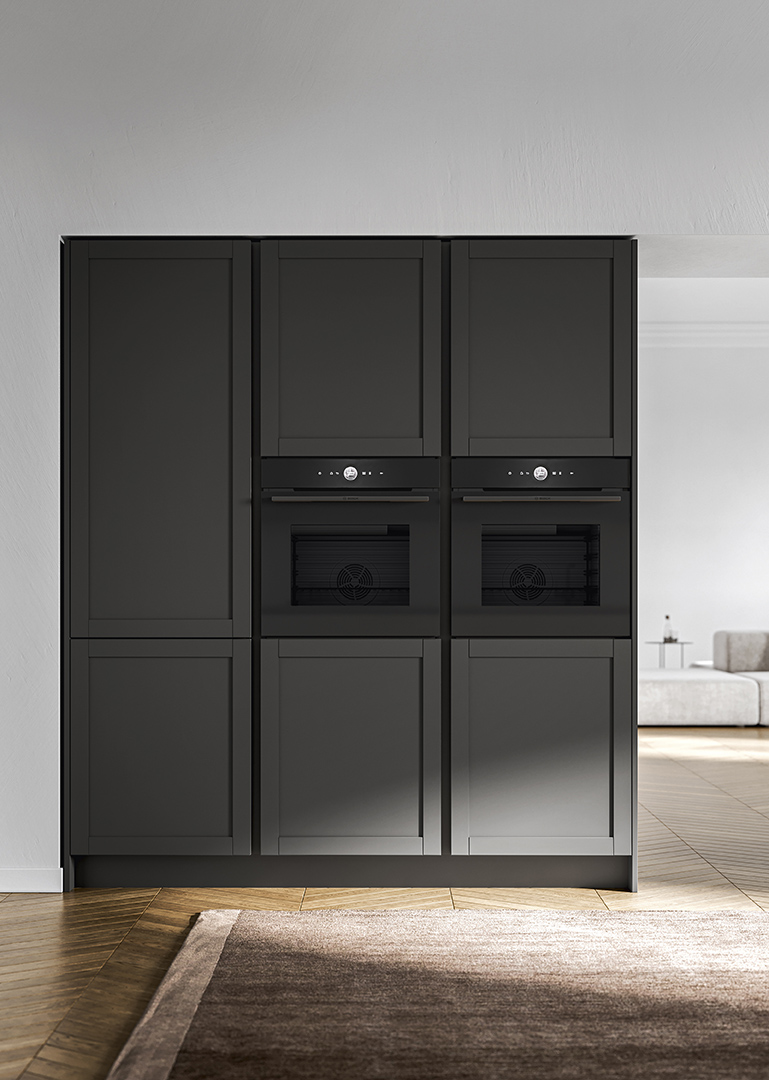 L'elemento tradizionale dell'anta a telaio viene evocato, ma rivisitato con un approccio moderno, enfatizzando un'estetica pulita e contemporanea.