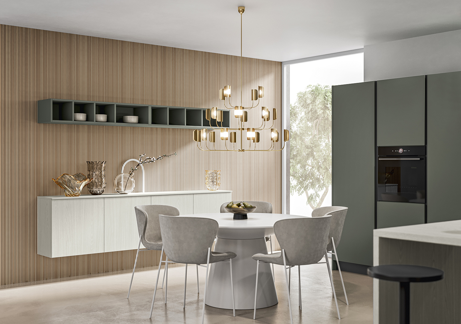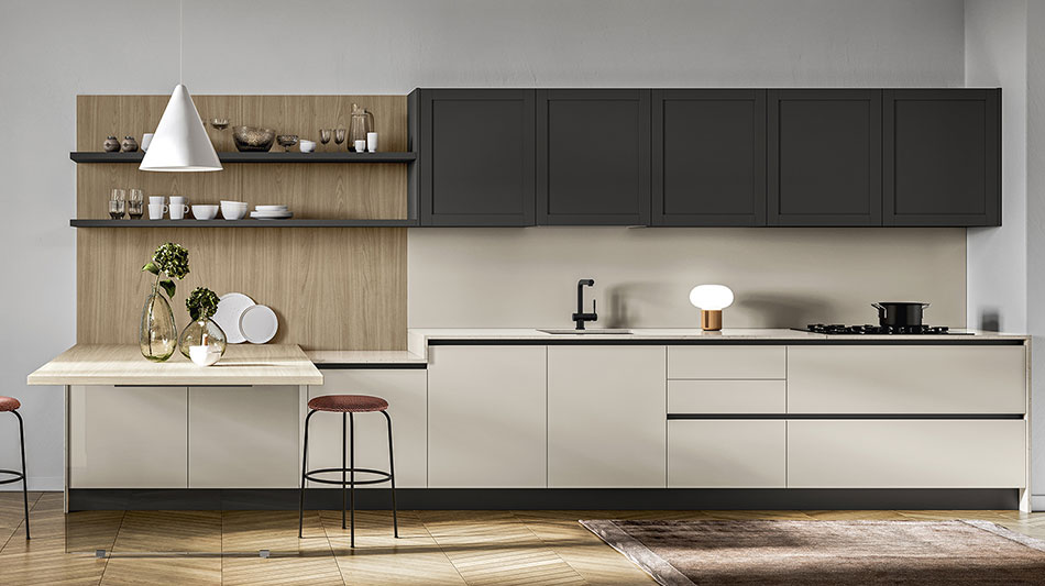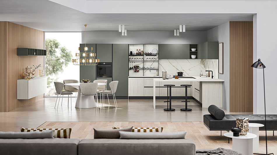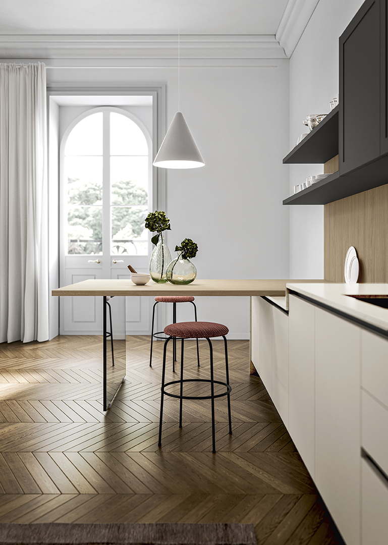 La cucina si organizza intorno a noi, creando angoli di benessere personalizzati. L'isola, collegata alle basi dal piano snack, diventa il punto focale dell'ambiente cucina.