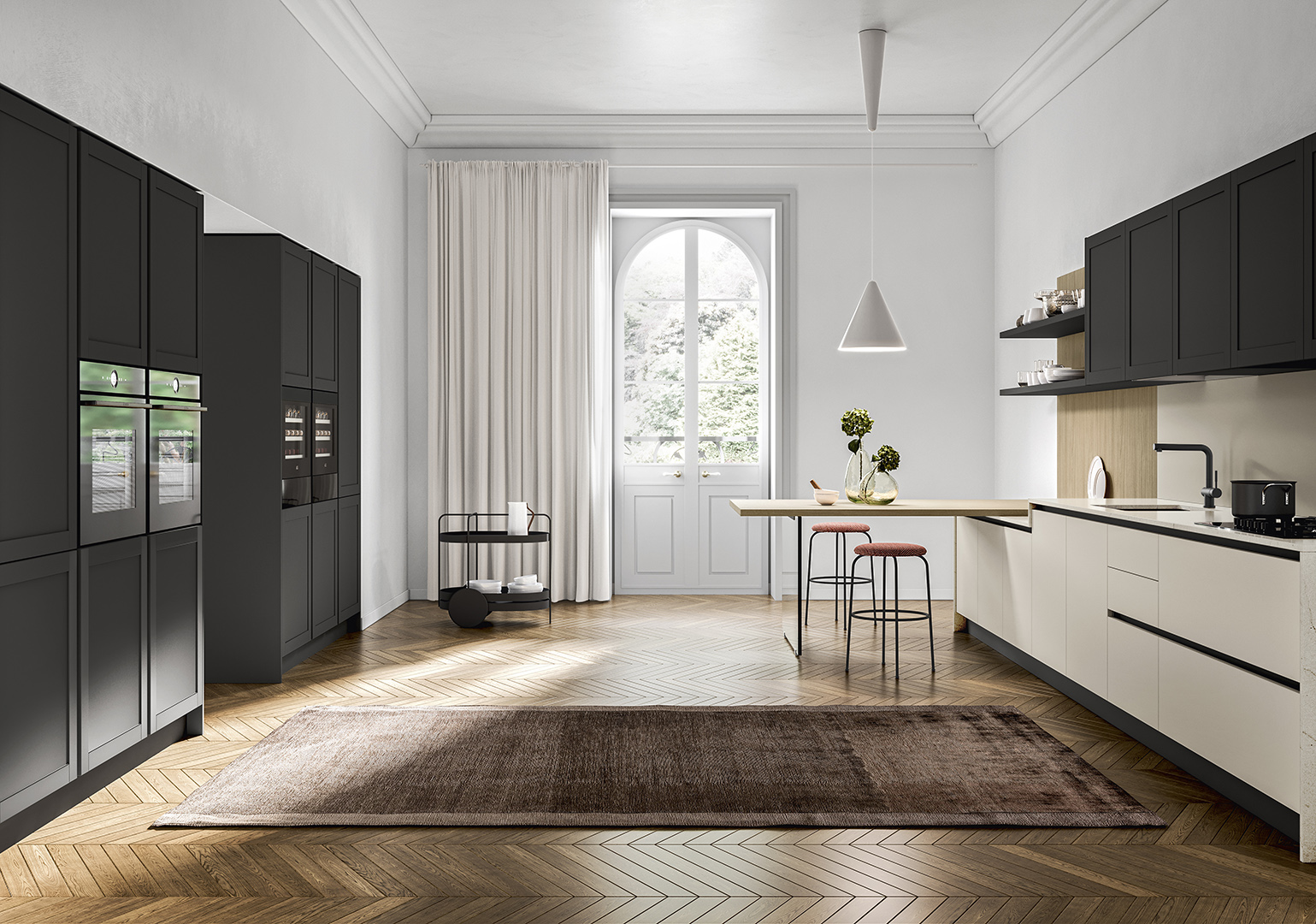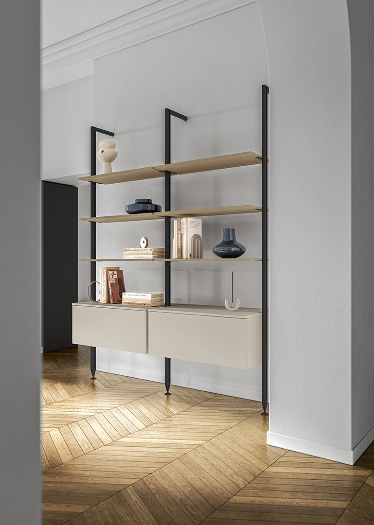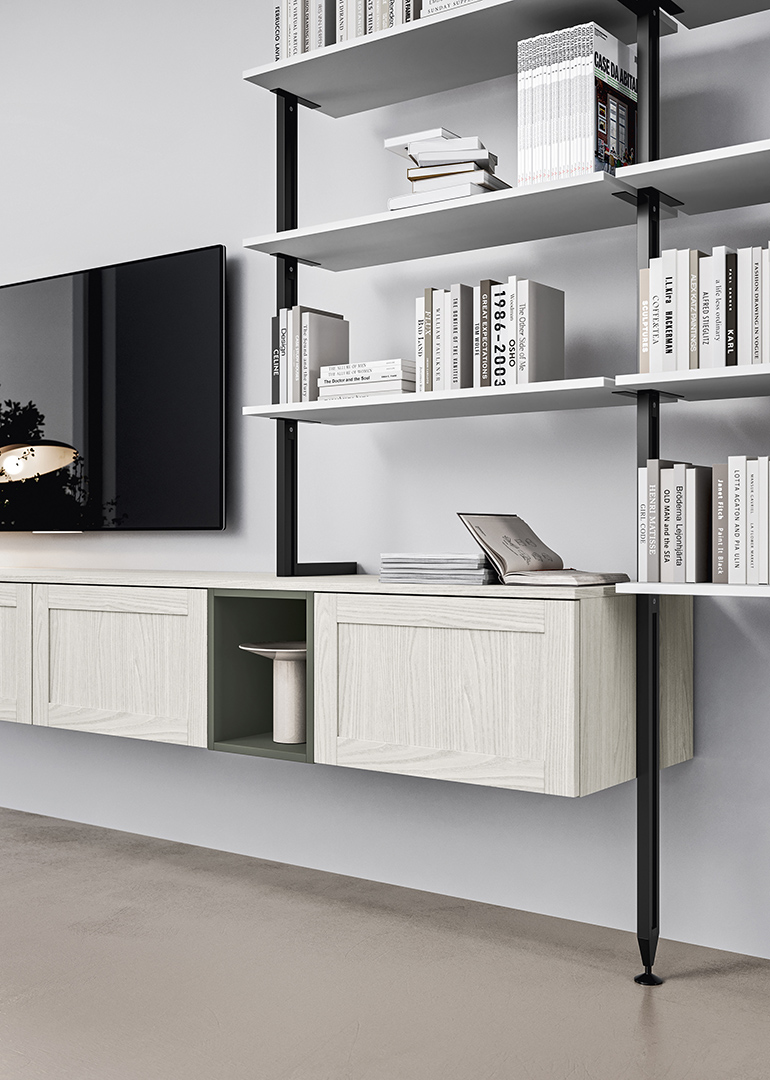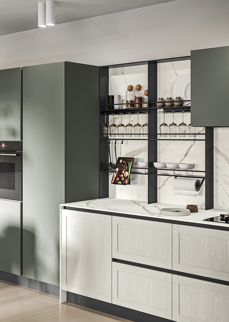 L'elemento tradizionale dell'anta a telaio viene evocato, ma rivisitato con un approccio moderno, enfatizzando un'estetica pulita e contemporanea.