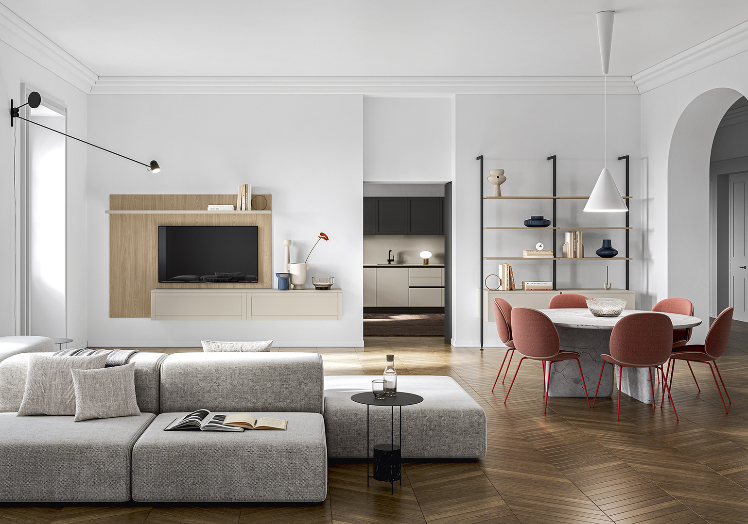 Esplora l'essenza della modernità con Prime di GiCinque. Il suo design pulito e deciso unisce linee decise e raffinate con il classico reinventato. L'organizzazione dello spazio è impeccabile, creando un ambiente accogliente e funzionale. Le finiture in rovere grano e le tinte naturali aggiungono calore e carattere, mentre i rivestimenti PET anti-impronta offrono una piacevole sensazione al tatto.